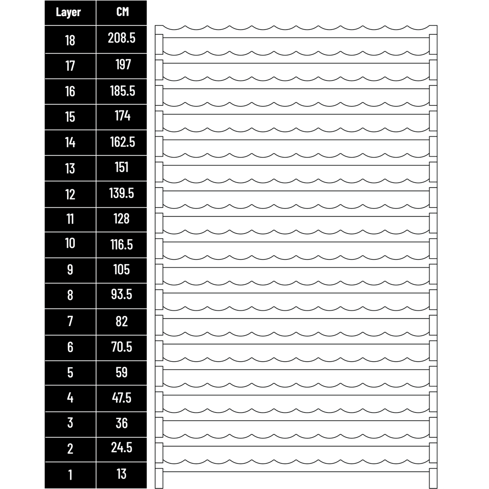 With a total capacity of 4 bottles per layer. Each additional layer adds an additional 11.5cm to the hight of the wine rack.